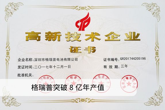 2017年,深圳市格瑞普電池有限公司通過“國家級高新技術(shù)企業(yè)”、“深圳市高新技術(shù)企業(yè)”復(fù)審,突破8億年產(chǎn)值!